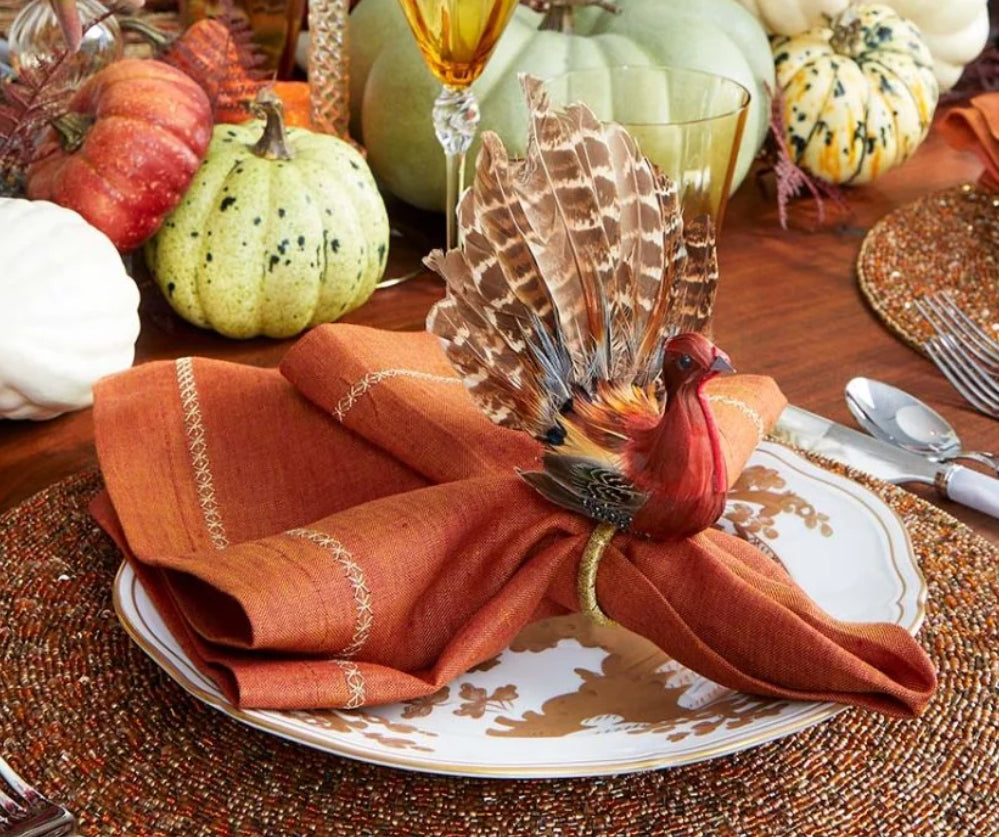 Set a stunning Thanksgiving table with The Gobble Napkin Ring, which features natural feathers in the shape of a turkey. Part of the autumnal Harvest Collection, these fall themed napkin rings will add a festive touch to your autumn table settings. This Thanksgiving Napkin Ring features fall shades of brown, reds and oranges.